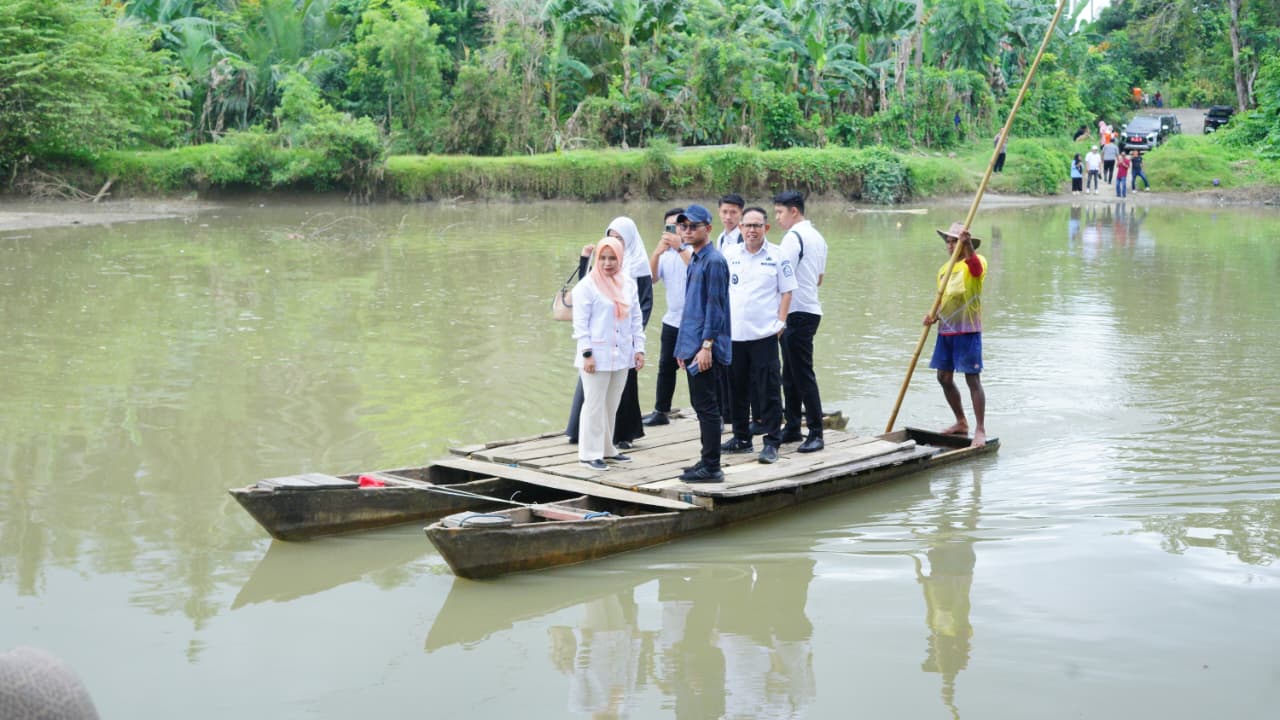 KABARTA.ID, BONE— Anggota DPRD Bone Andi Nurjaya, S.H., bersama Wakil Bupati Bone, Dr. H. Andi Akmal Pasluddin, S.P., M.M., menggunaka pincara atau perahu rakitan tradisional yang biasa digunakan warga untuk tiba di Desa Pasaka, Kecamatan Sibulue, Rabu (27/8/2025).