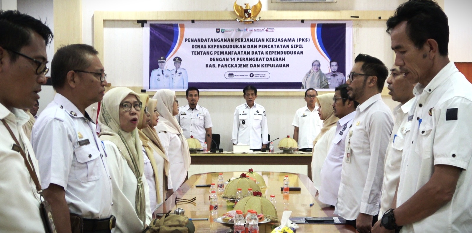 KABARTA.ID, PANGKEP— Pemerintah Kabupaten Pangkep terus meningkatkan kualitas layanan publik dengan memanfaatkan data kependudukan yang akurat. Sebanyak 14 perangkat daerah di Kabupaten Pangkep menandatangani Perjanjian Kerja Sama (PKs) dengan Dinas Pencatatan Sipil (Disdukcapil) terkait hak akses data kependudukan, Rabu (24/9/2025).