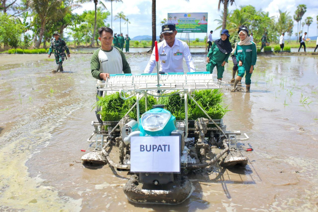Simbol dimulainya penanaman ditandai dengan pengoperasian mesin transplanter oleh Bupati Bone bersama Dandim, Kapolres, dan Kadis Pertanian sebagai wujud penerapan mekanisasi pertanian modern.