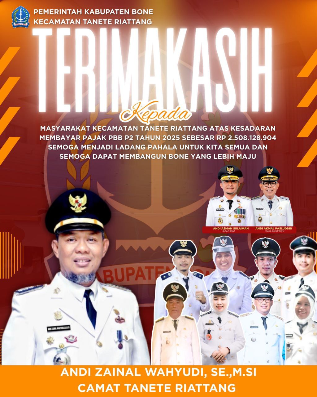 KABARTA.ID, BONE— Pemerintah Kecamatan Tanete Riattang menyampaikan apresiasi dan rasa terima kasih kepada masyarakat atas kesadaran dalam membayar Pajak Bumi dan Bangunan Perdesaan dan Perkotaan (PBB-P2) tahun 2025.