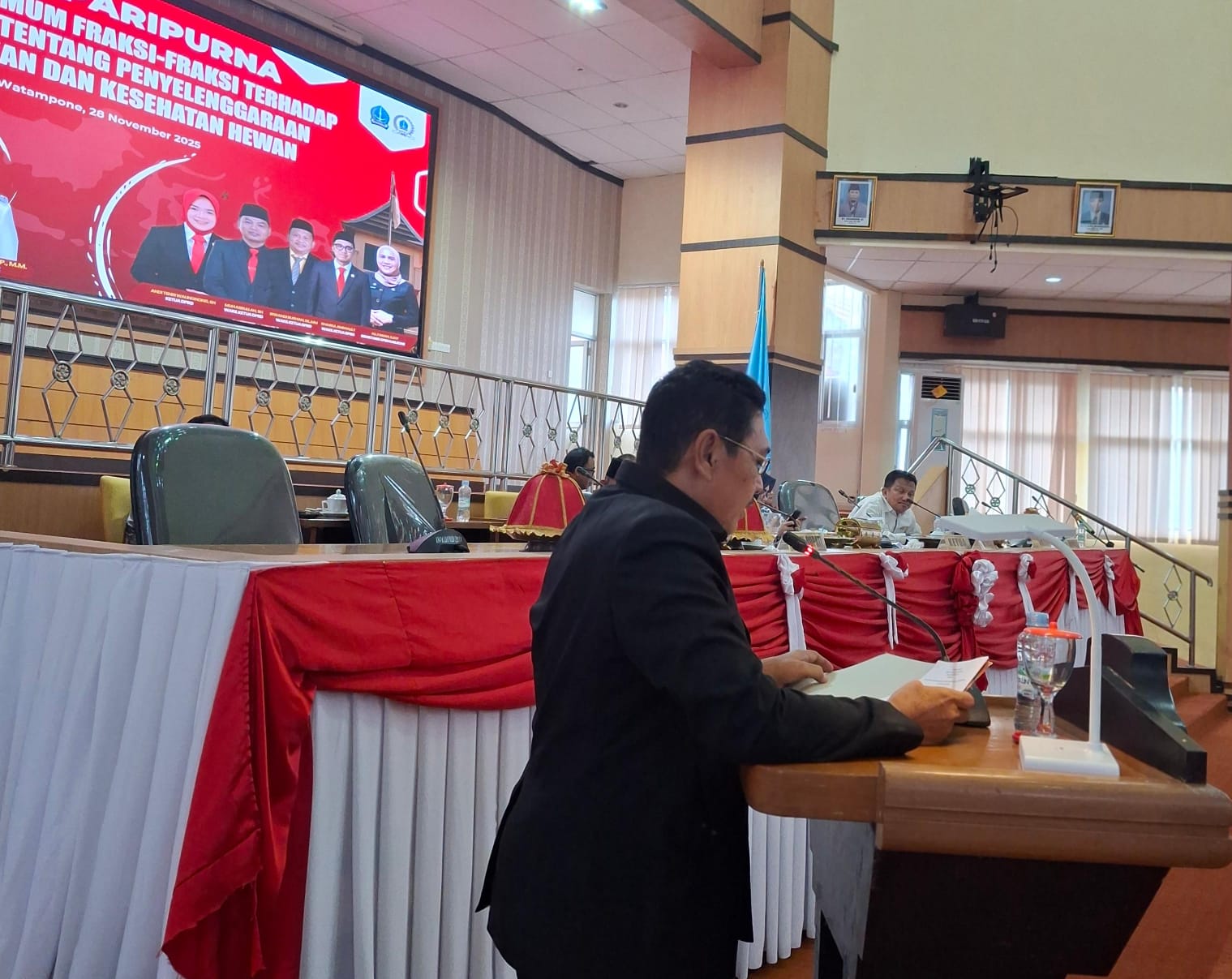 KABARTA.ID, BONE— DPRD Kabupaten Bone menggelar Rapat Paripurna dengan agenda penyampaian pandangan umum fraksi terhadap Rancangan Peraturan Daerah (Ranperda) tentang Penyelenggaraan Peternakan dan Kesehatan Hewan, Jumat (28/11/2025).