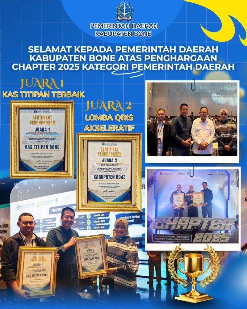 KABARTA.ID, MAKASSAR— Kabupaten Bone kembali menunjukkan komitmennya dalam transformasi digital. Pada ajang Collaborative and High-Impact Payment System Appreciation (CHAPTER) 2025 yang digelar Kantor Perwakilan Bank Indonesia (BI) Sulawesi Selatan, Bone berhasil meraih Juara 2 Kategori QRIS Akseleratif.
