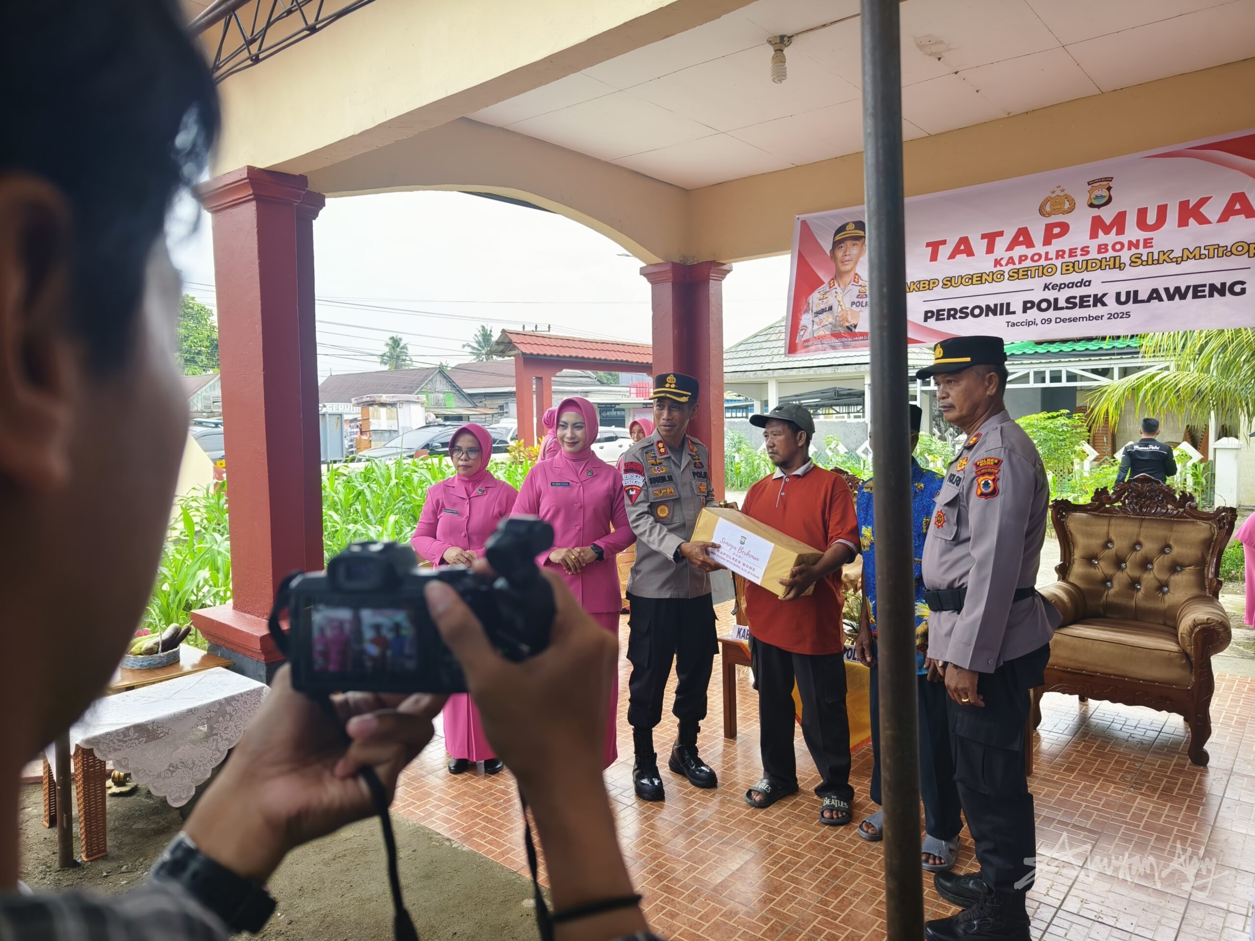 Kapolres Bone AKBP Sugeng Setio Budhi memberikan bantuan kepada sejumlah masyarakat di Kecamatan Ulaweng, Kabupaten Bone. Hal ini dilakukan AKBP Sungeng saat kunjungan kerja bersama Ketua Bhayangkari Cabang Bone Ny Shita Sugeng di Mapolsek Ulaweng, Selasa (9/12/2025).