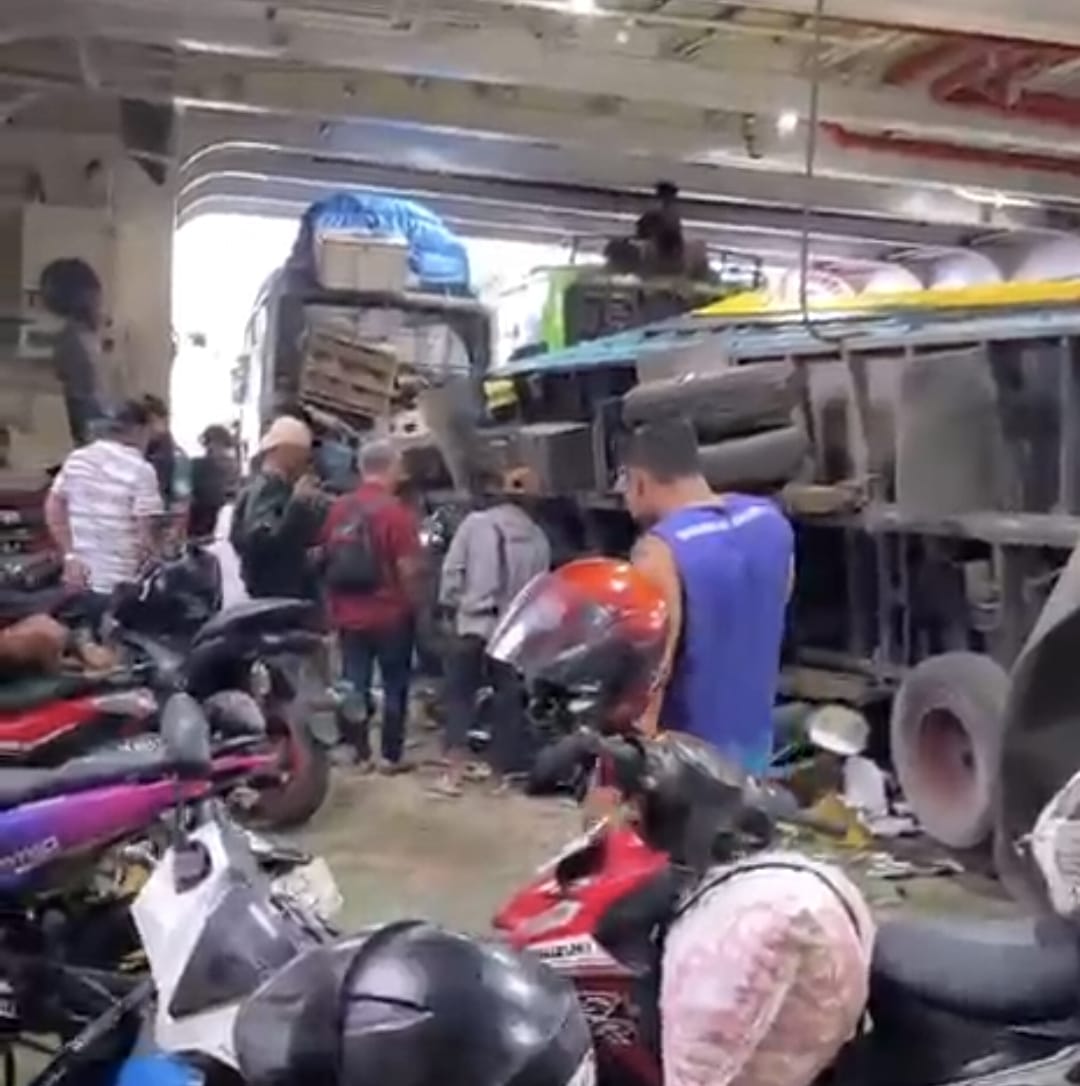 Rekaman video yang beredar memperlihatkan beberapa mobil dalam posisi miring hingga terguling. Bahkan, satu unit mobil pengangkut ikan terlihat terbalik dengan muatan ikan berserakan di dalam kapal.