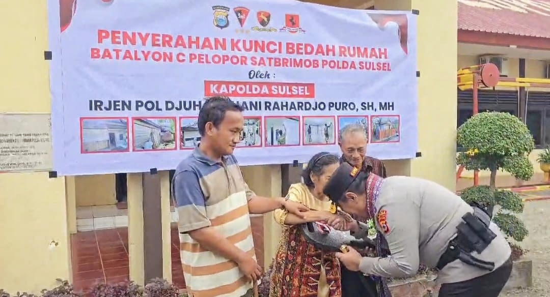 Bertempat di Mako Batalyon C Pelopor Satbrimob Polda Sulsel, suasana yang awalnya berlangsung khidmat dalam prosesi penyerahan bantuan program bedah rumah, seketika berubah menjadi haru.