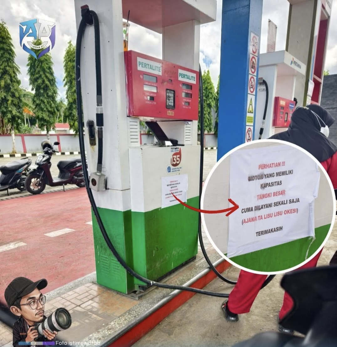“Perhatian, motor yang memiliki kapasitas tangki besar, cuma dilayani sekali saja, ajana ta lisu lisu, okesi, ” demikian pesan yang tertempel di SPBU tersebut.