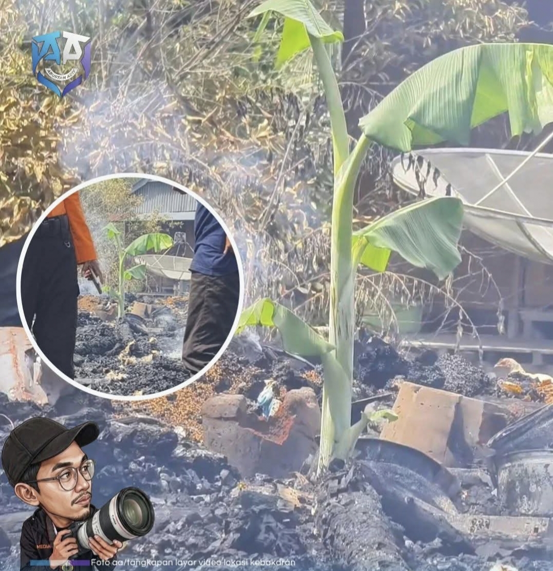 Pantauan di tkp, pohon pisang tampak tak hangus sedikit pun di tengah lokasi kebakaran yang telah jadi arang hangus menghitam. Pohon pisang tampak seperti tumbuh subur di tengah puing-puing sisa kebakaran rumah panggung di lokasi ini.