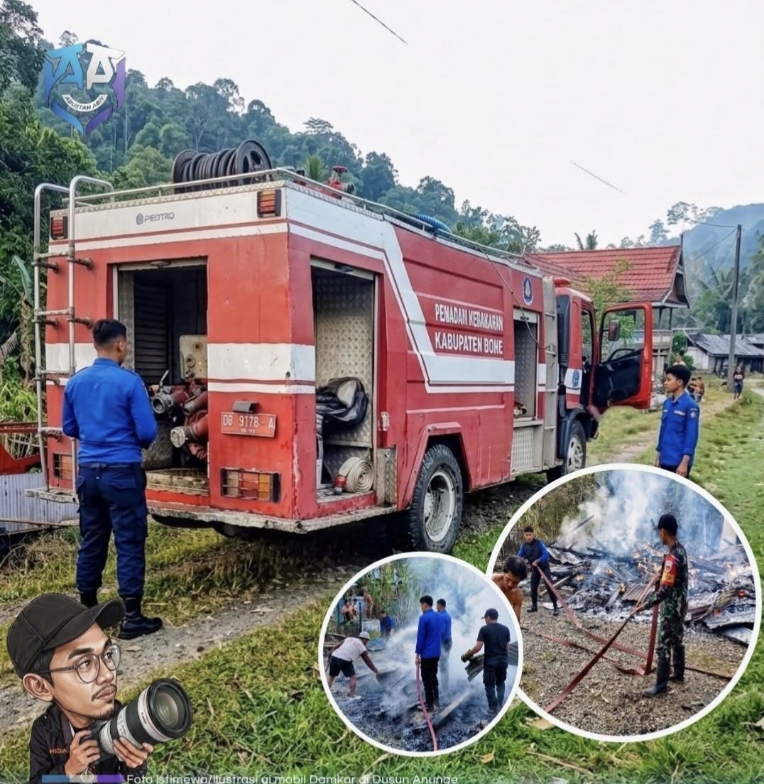 Potret perjuangan Damkar bantu padamkan kebakaran di Dusun Annunge Desa Walimpong Kecamatan Bengo Kabupaten Bone, Jumat (17/4/2026) sekira pukul 05:30 wita. Informasi diperoleh dusun ini merupakan dusun terpencil di daerah ini.