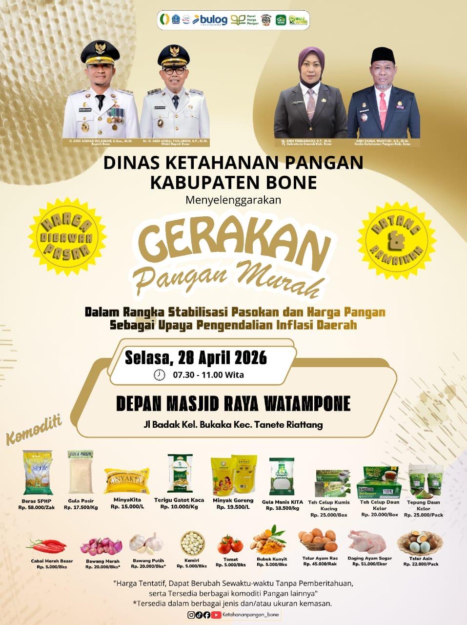 KABARTA.ID, BONE— Dinas Ketahanan Pangan Kabupaten Bone akan menggelar Gerakan Pangan Murah sebagai upaya menjaga stabilitas pasokan dan harga pangan serta menekan inflasi daerah.